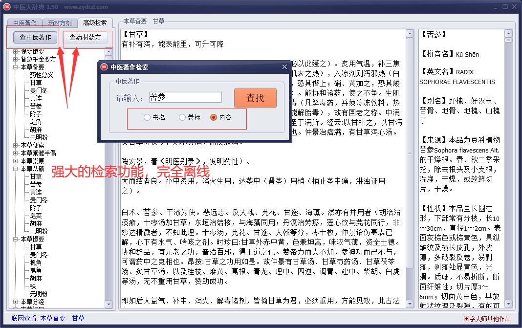 為了方便閱讀,本軟件還配備了小字典功能;在閱讀框內(nèi)選中藥材名稱,可快速查詢?cè)撍幉牡挠梅敖忉尅?br>